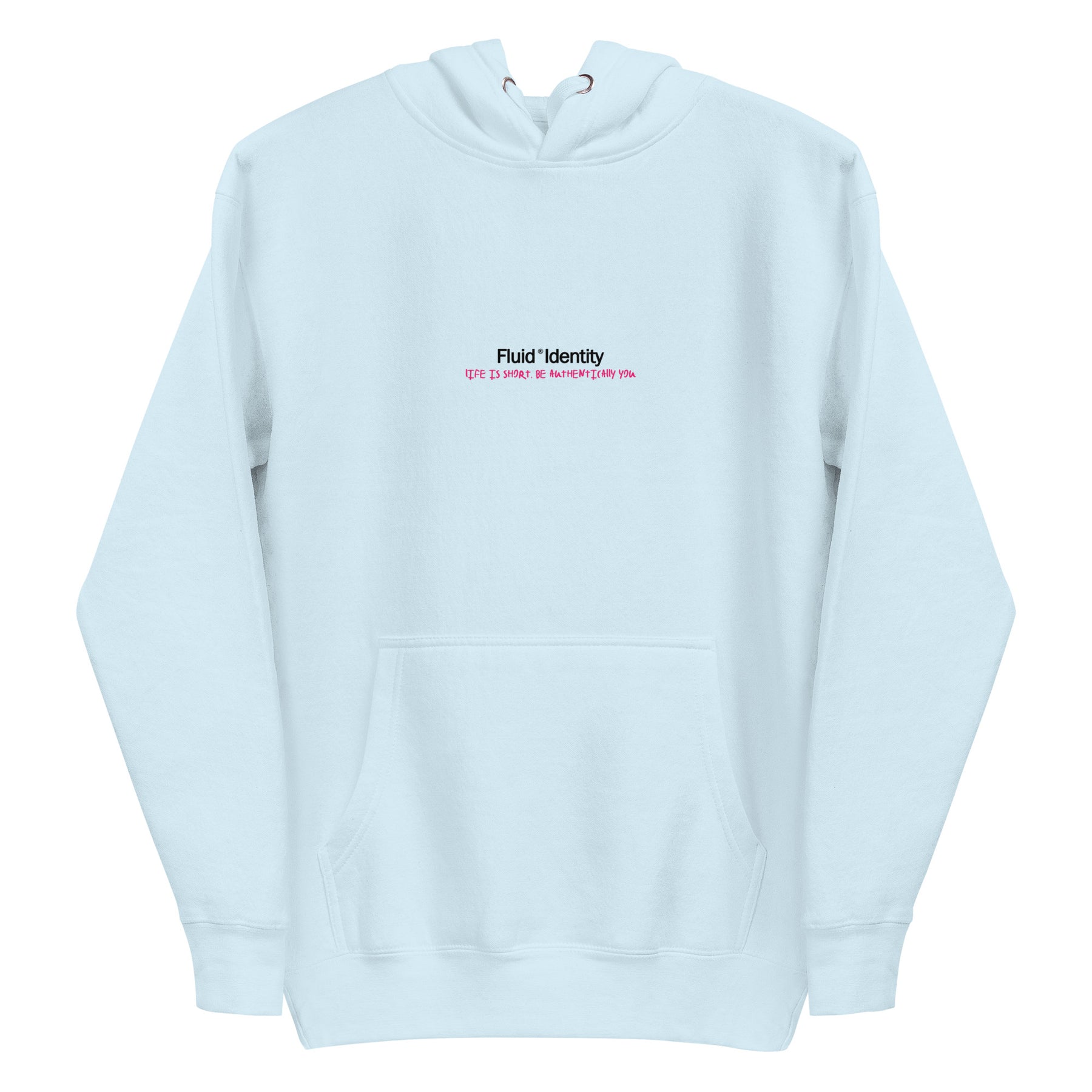 Light blue hoodie from Fluid Identity showcasing Urban Style Streetwear Fashion with a stylish front pocket