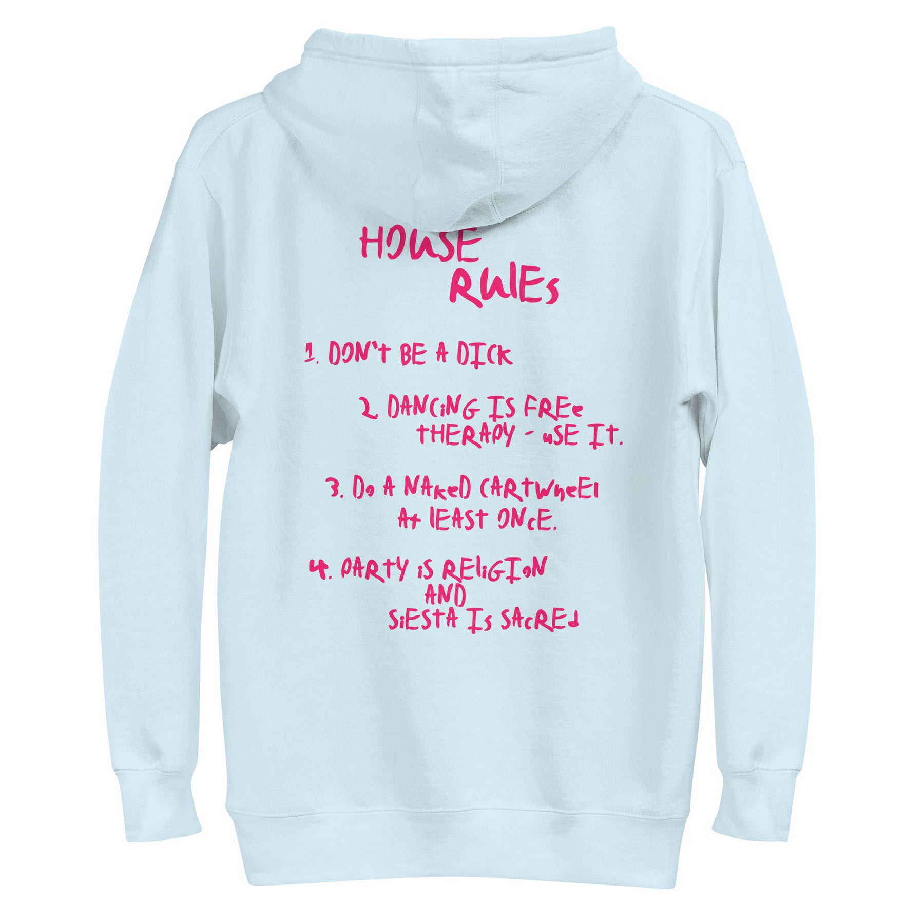 Light blue hoodie featuring House Rules design, perfect for Urban Style Streetwear Fashion enthusiasts