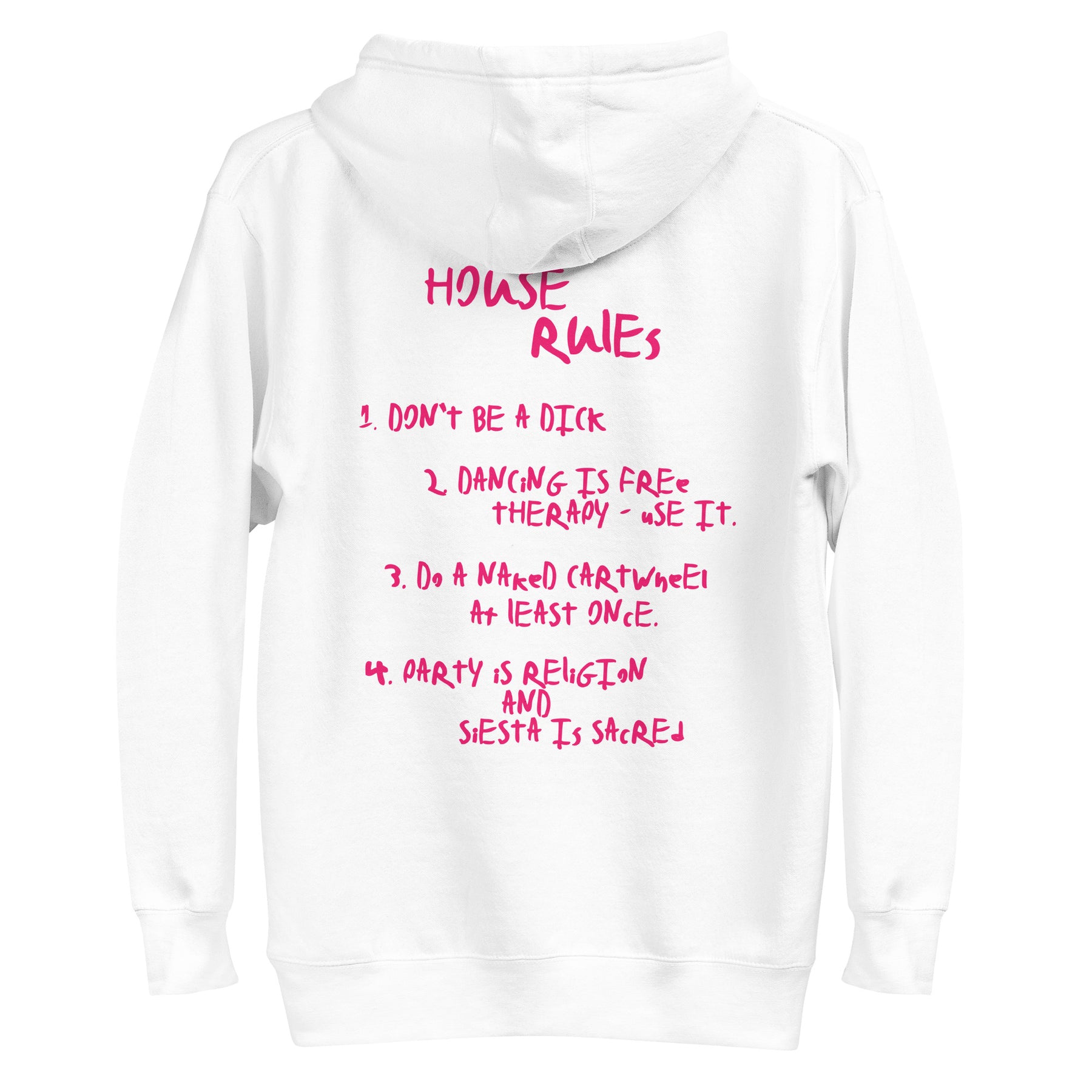 White hoodie with House Rules graphic for Urban Style Streetwear Fashion enthusiasts