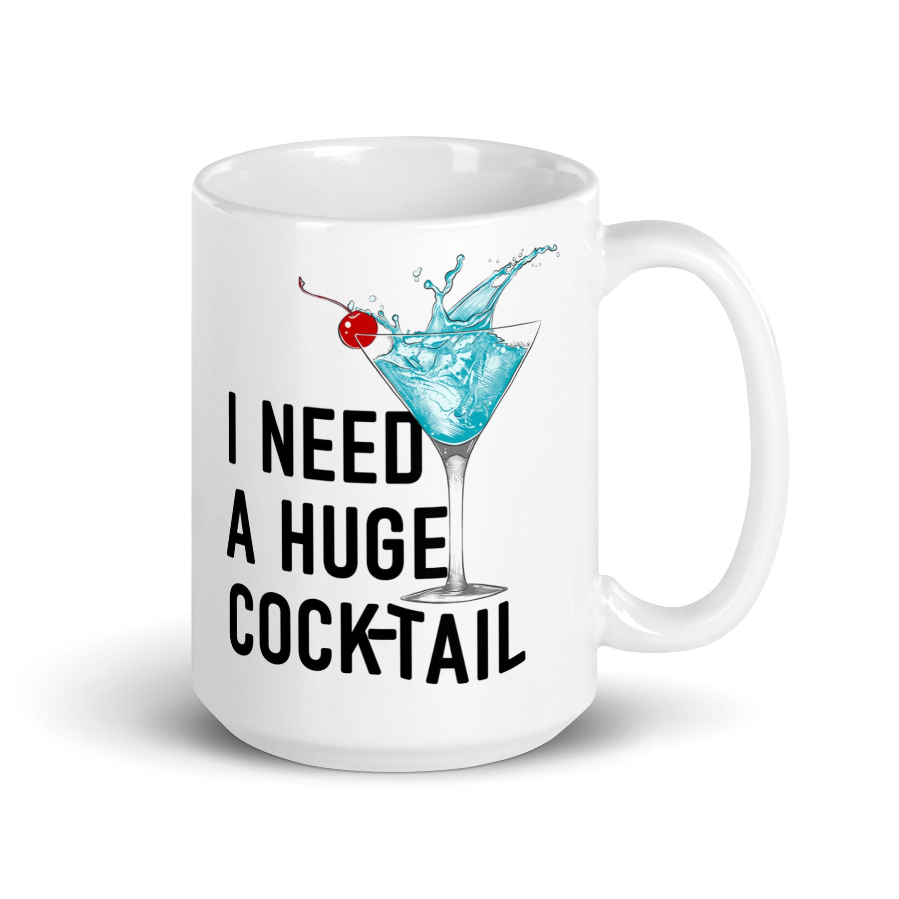 Funny Satire Coffee Mug featuring a martini glass with the text I Need a Huge Cock-Tail