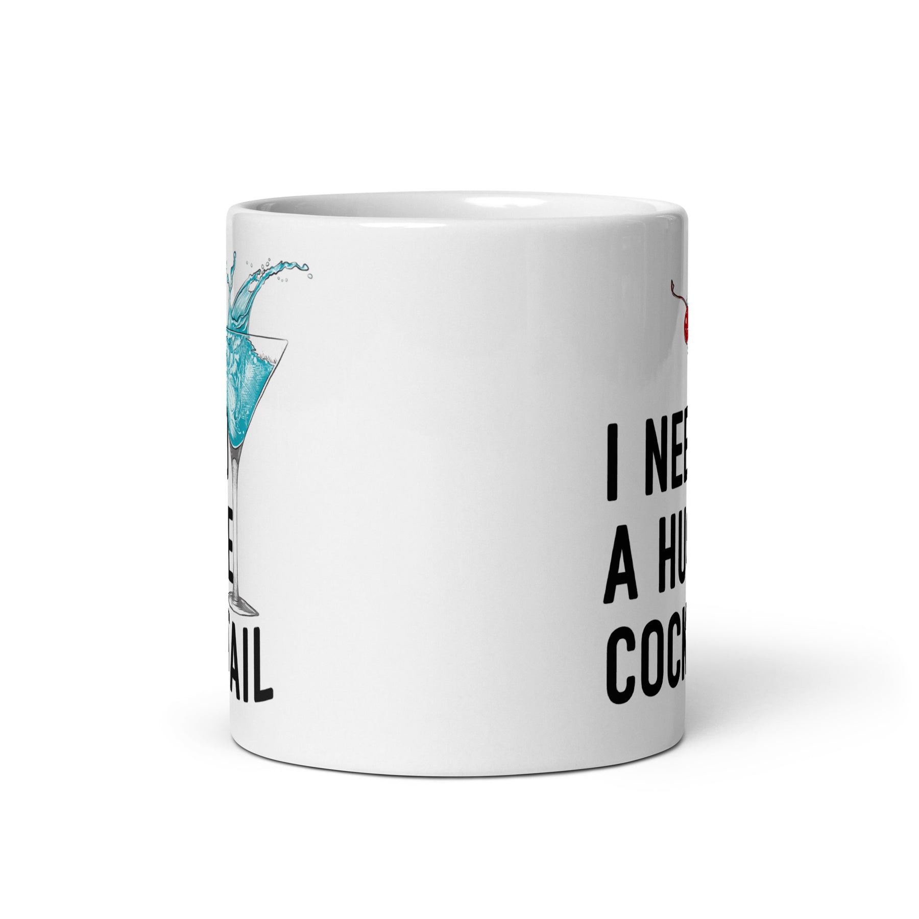 Funny Satire Coffee Mug with a cocktail design and text saying I Need a Huge Cocktail