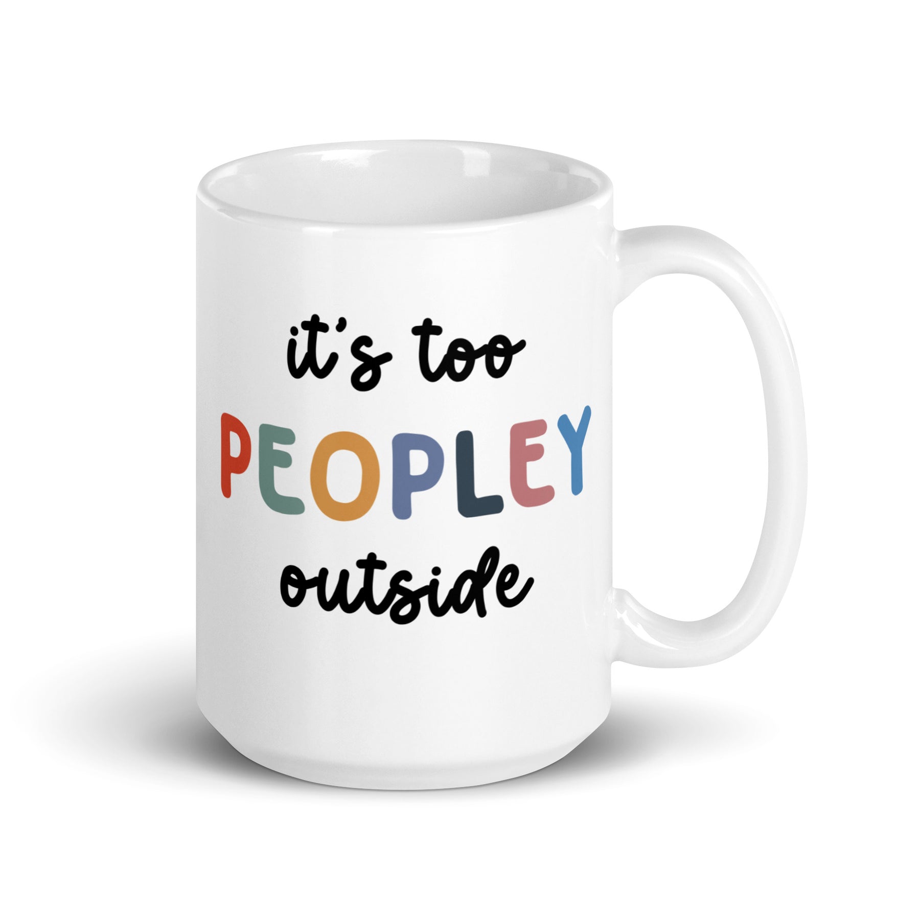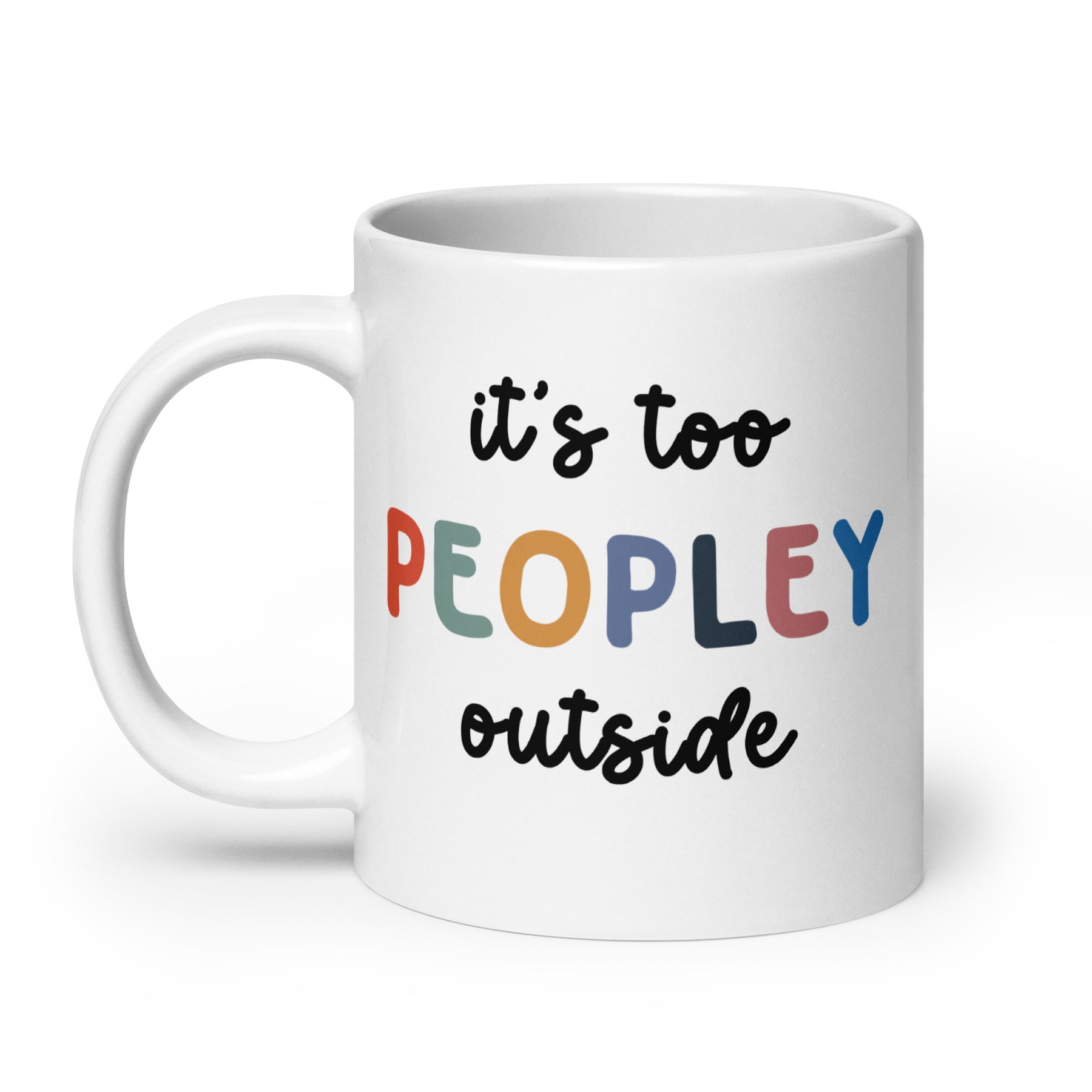 Funny Satire Coffee Mug with 'It's too Peopley Outside' design in colorful letters