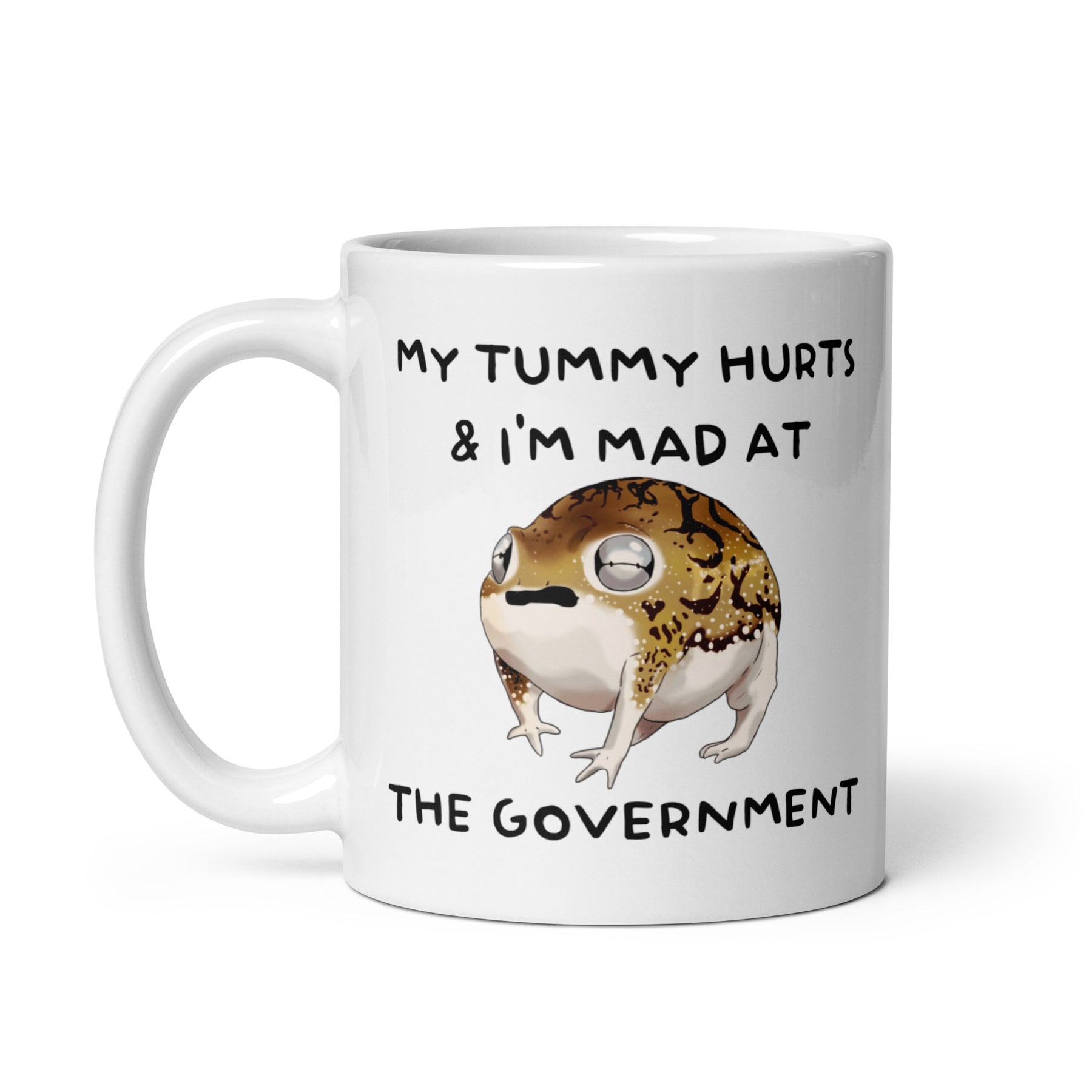 Funny Satire Coffee Mug featuring a frog with the text 'My tummy hurts & I'm mad at the government'