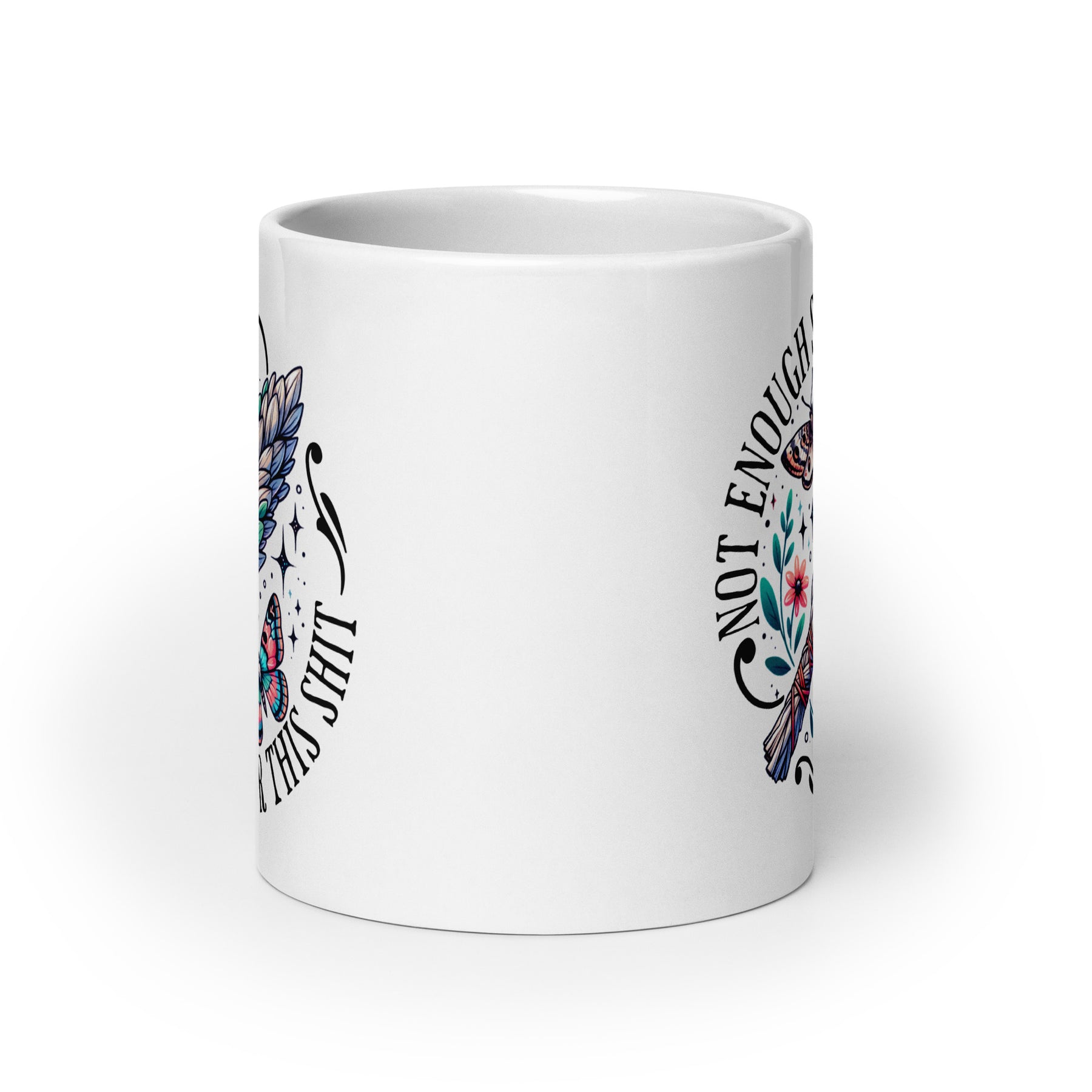 Funny Satire Coffee Mug with intricate floral design and butterflies saying Not Enough Sage for This Shit