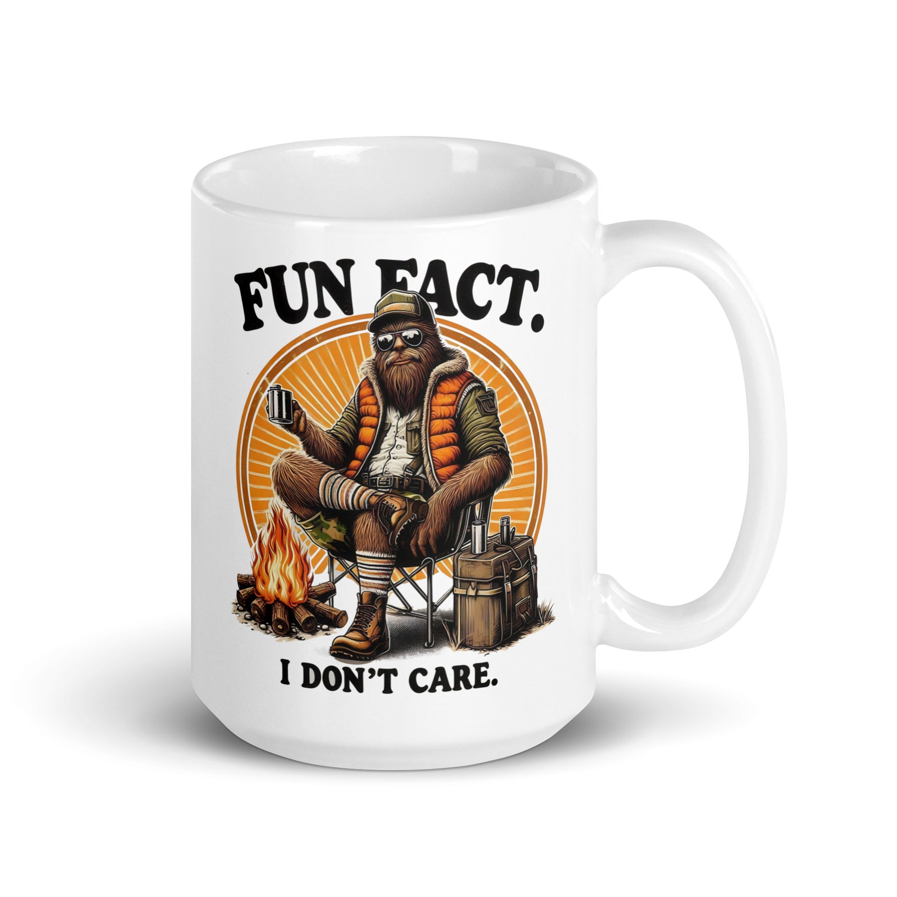 Funny Satire Coffee Mug featuring a relaxed camper with the text Fun Fact. I Don't Care.