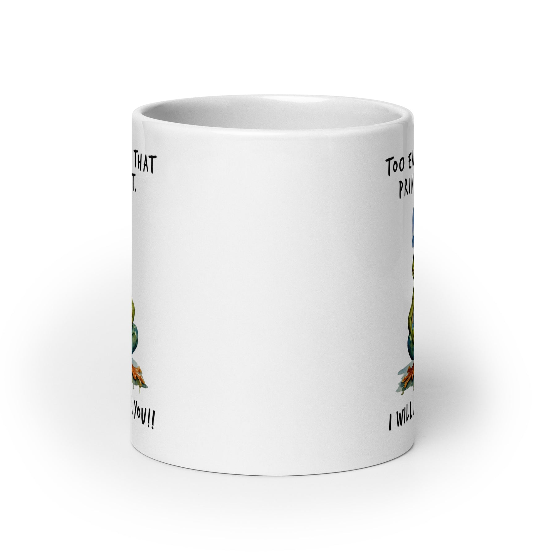 Funny Satire Coffee Mug featuring a frog with a threatening message for morning coffee lovers