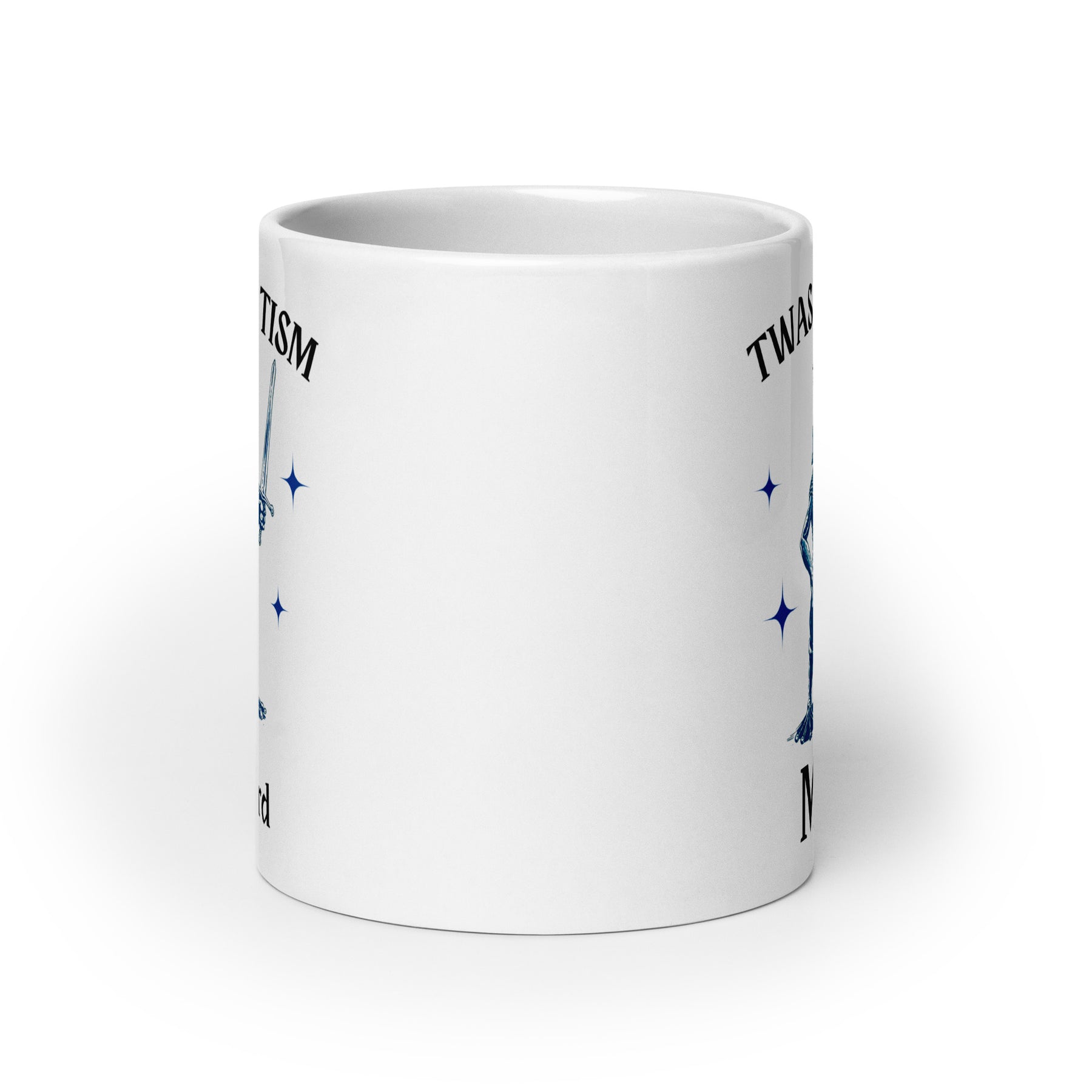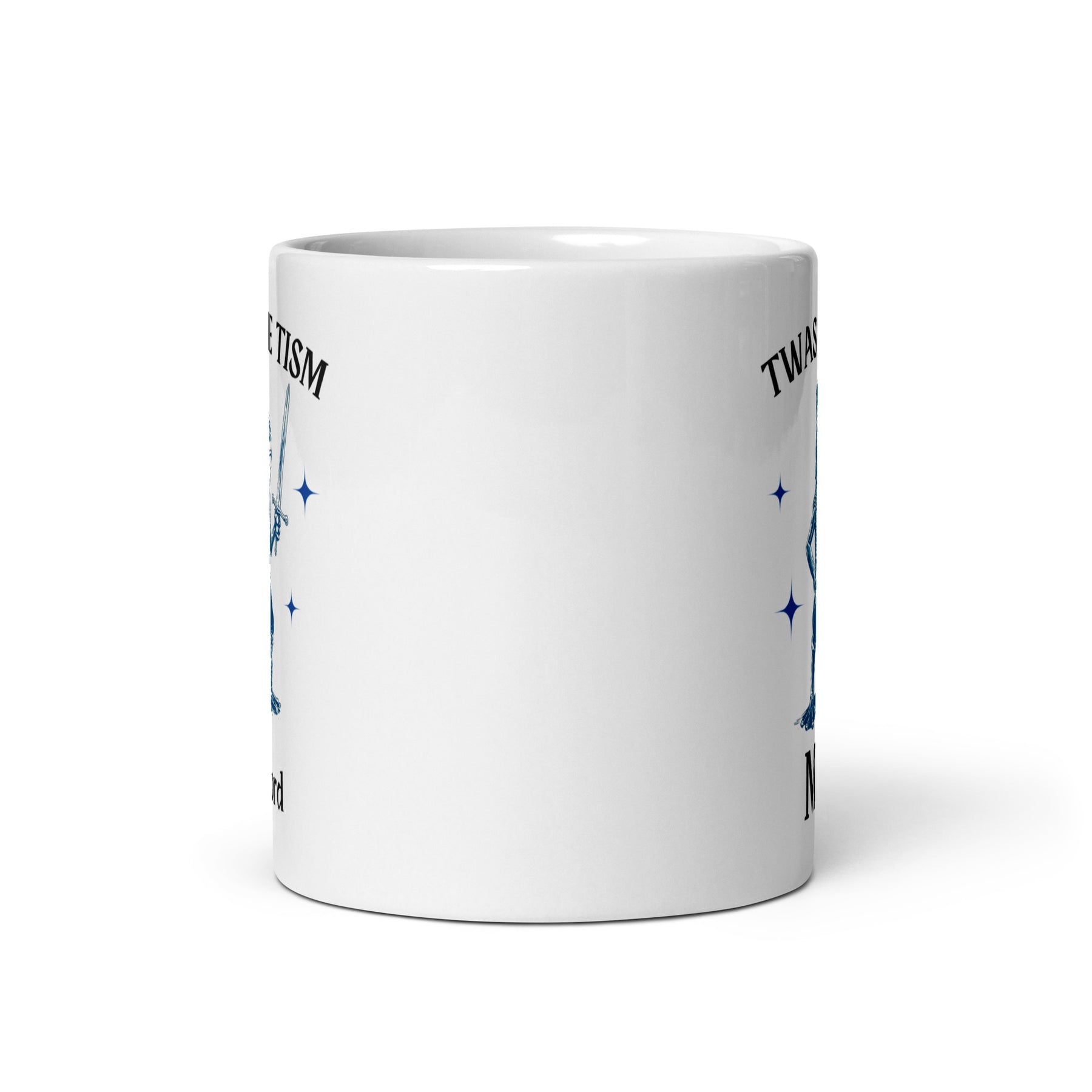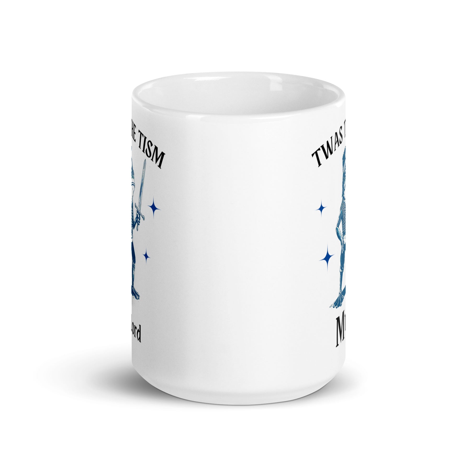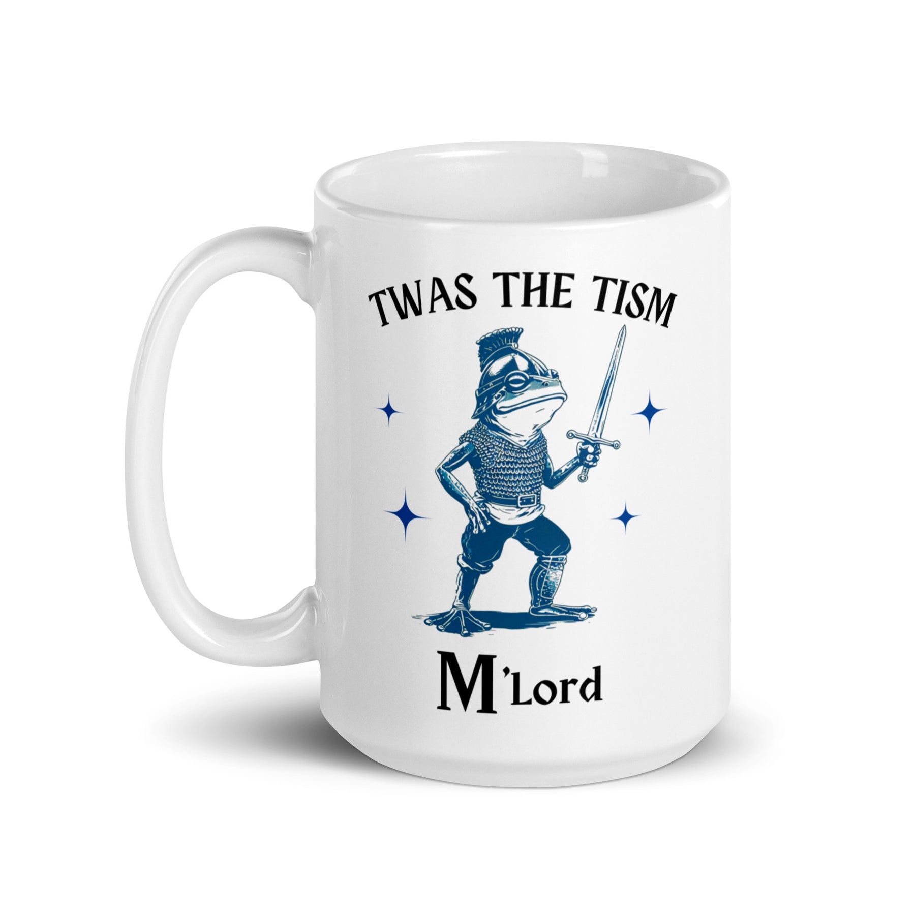 Funny Satire Coffee Mug featuring a frog in armor with the text 'Twas the Tism M'Lord'